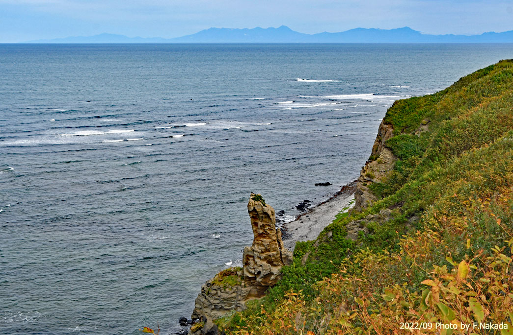 ![]() 能取岬灯台の裏には,知床半島の全容を望むことのできる場所があり,晴れた日にはこの写真のような景色を見ることができます。 一方,下の海岸線に目を向けると,少し曲がったロケット状の「岩柱」が立っていることに気が付くでしょう。 |