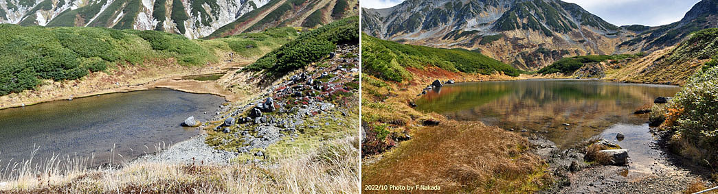 ![]() 「ミドリガ池」は,楕円形をした「爆裂火口」です。 火口自体も細長くなっており,写真(左)のように上流部にも小さな池が存在しています。 一方,写真(右)のように,池の最下流部から少量の水が溢れ出ています。 未確認ですが,「ミクリガ池」に注いでいると思われます。 |