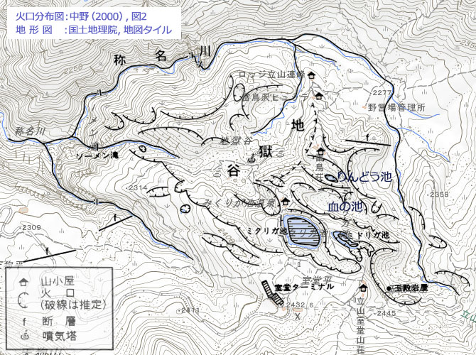 ‼マウスオーバー‼ 地図上にマウスを乗せてください。産総研・地質調査総合センターの 5万の1地質図幅「立山」(出典,下記)を表示します。![]() 種々の資料をまとめると,室堂平では「ミクリガ池」,「ミドリガ池」,「りんどう池」,「血の池」一帯や「玉殿岩屋」周辺部 等に見られる「凹地(窪地)」の大部分が「火口(爆裂火口)」と評価されています。 一方,「称名川」の侵食域では,「山崎カール」などに代表される,「氷河」由来の岩屑が広範囲に堆積しています。 まとめると,基本的に室堂平は火山性地形なのですが,氷河によって運ばれてきた堆積物が生んだ地形が混在しています。 |