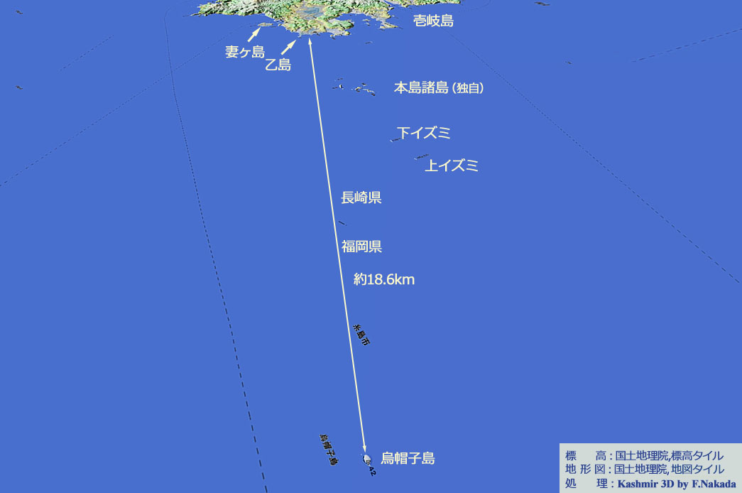 ![]() 「烏帽子島」は,壱岐島の南東19km弱の「壱岐水道」の東端部に位置しています。 烏帽子島~壱岐島の中間よりやや西寄りには,「上・下イズミ」の岩礁と,「本島」を中心とする無人島群(本島諸島と称す)が浮かんでいます。 なお,烏帽子島と上・下イズミの間に県境があり,前者側は福岡県で後者側は長崎県となっています。 |