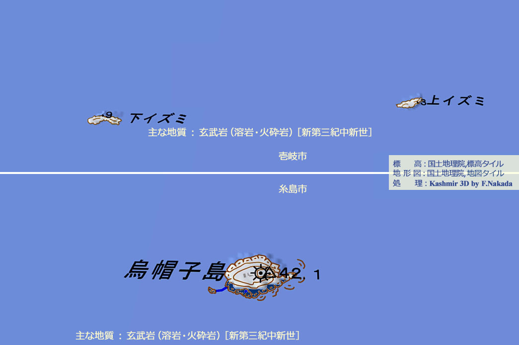 ![]() 「烏帽子島」とそれから数キロメートル離れている「上・下イズミ」は,いずれも「玄武岩」の溶岩でできた島や岩礁です。 これら玄武岩を噴出させた火山(火口)は,近くにあったのか,それともある程度離れていたのか,興味は尽きません。 |