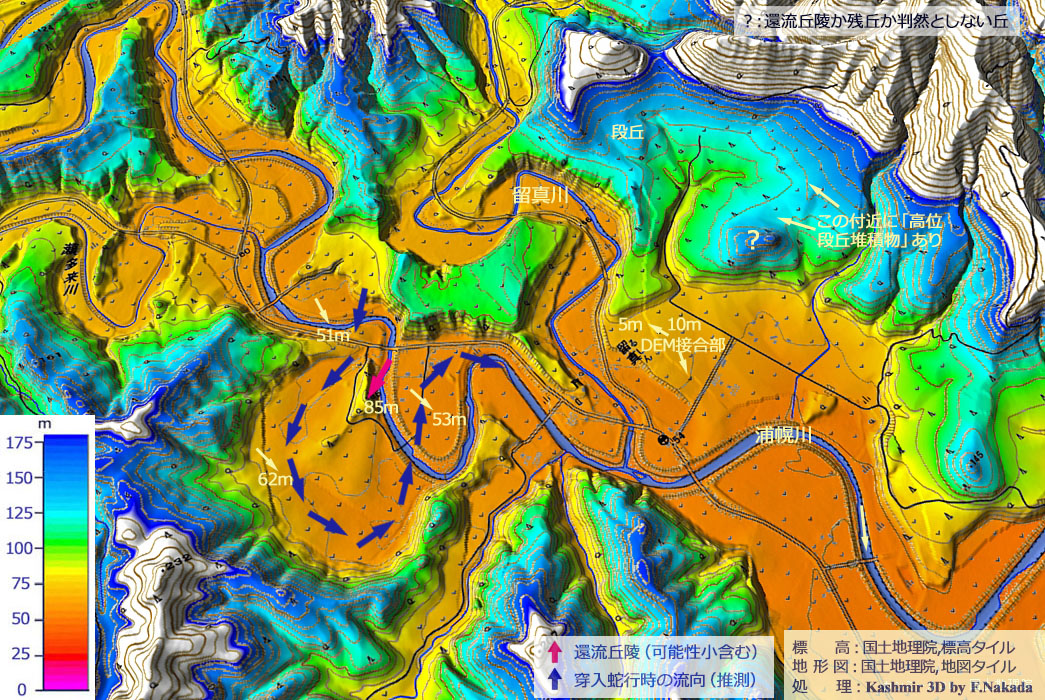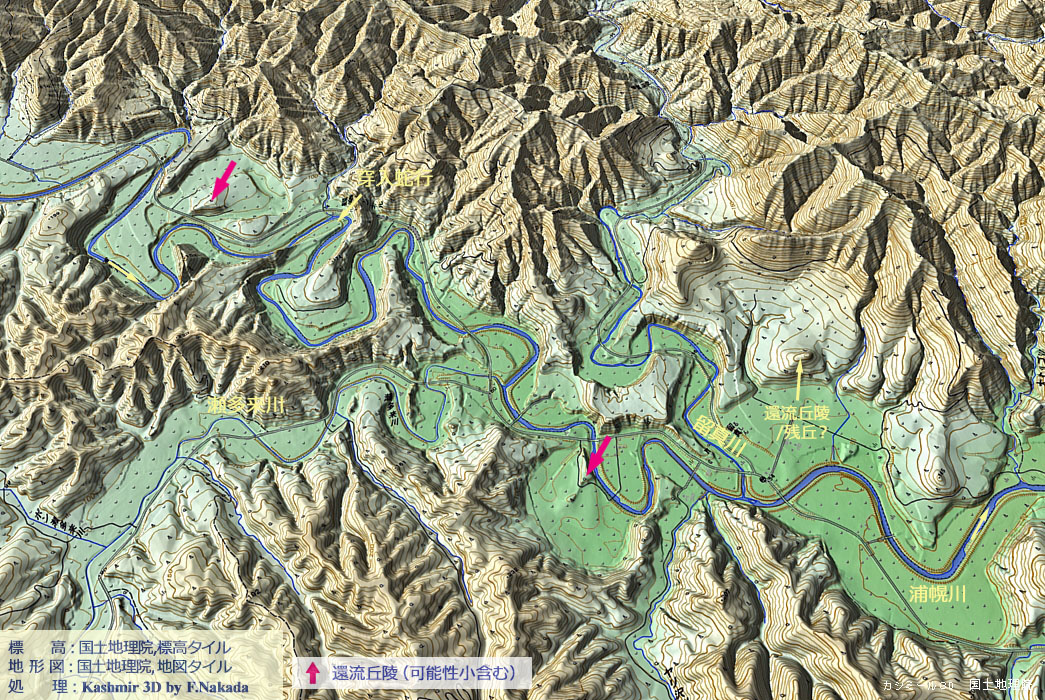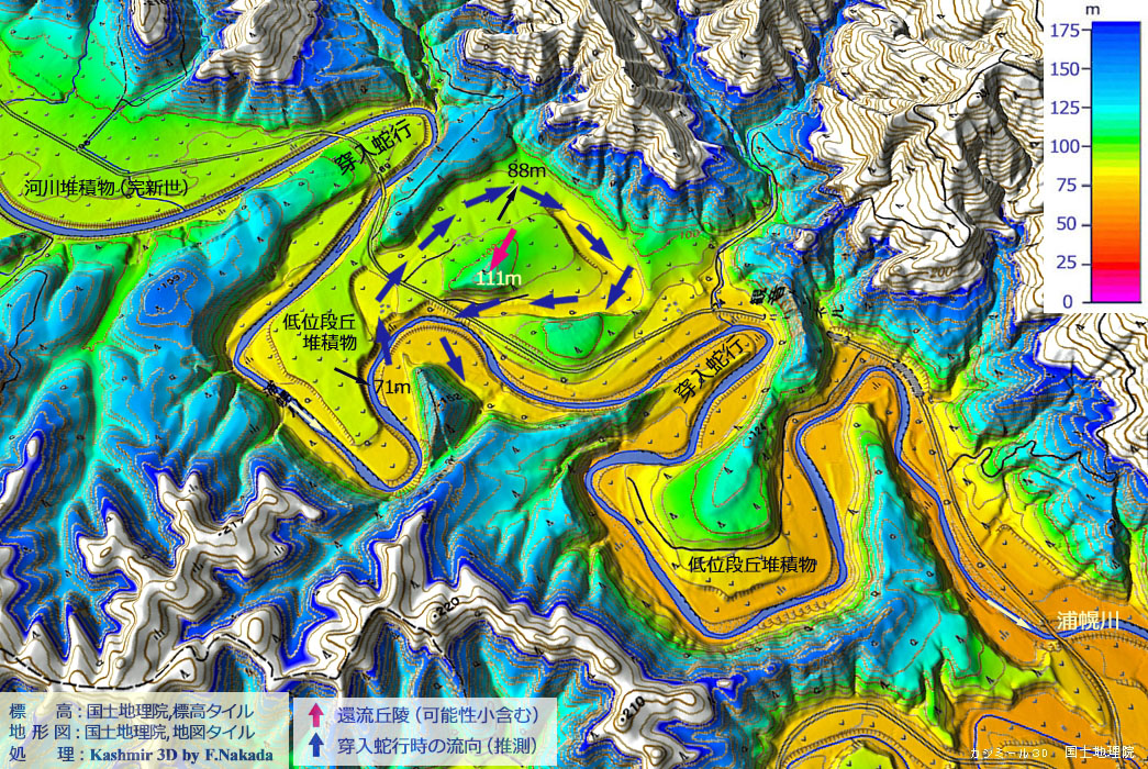 ![]() 「流路(正しくは流向)」は,あくまでもこのようになっていたのでは,という想像線です。 この付近の「穿入蛇行」は,直線状の流路が目立つという特徴があって,「環流丘陵」の旧流路にもそれが残っています。 |