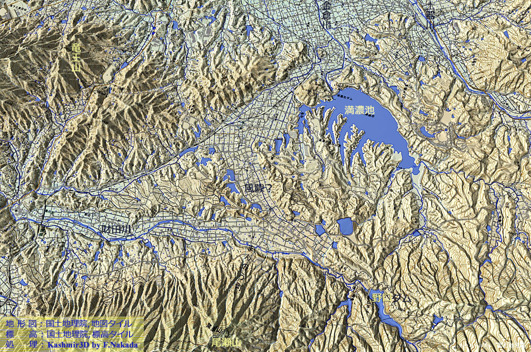 | 案内用,地形の三次元イメージ : 満濃池と金倉川および財田川 |