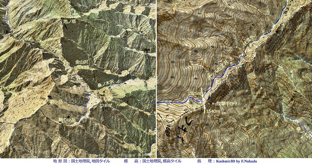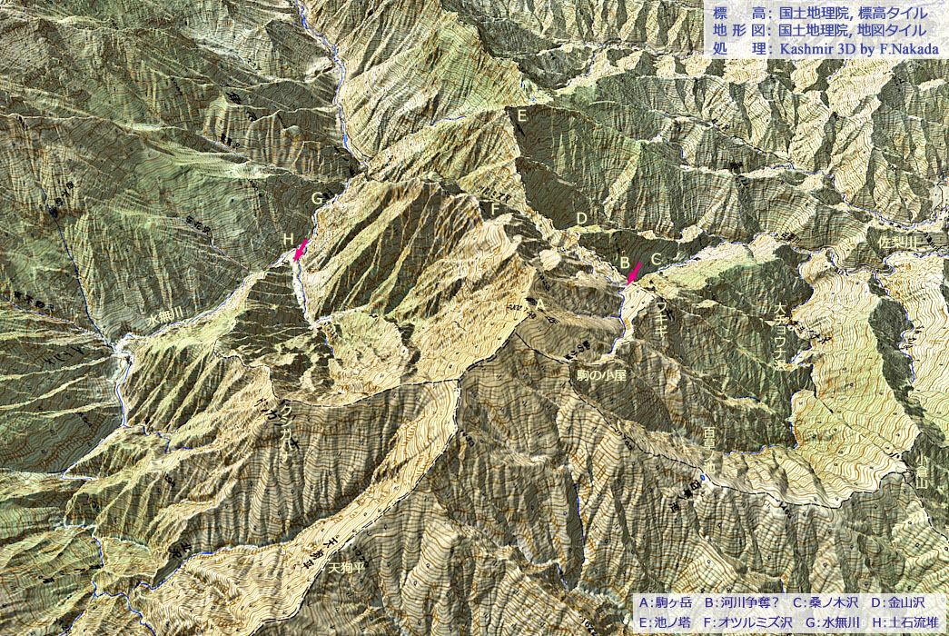 | 地形の三次元イメージ : オツルミズ沢と桑ノ木沢の河川争奪(推定:進行中) |