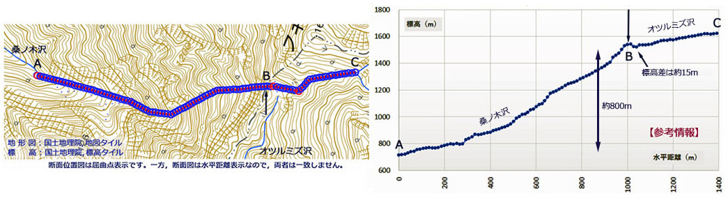 ![]() 「桑ノ木沢(A)」~尾根(B)~「オツルミズ沢源流部(C)」の地形断面図です。 |