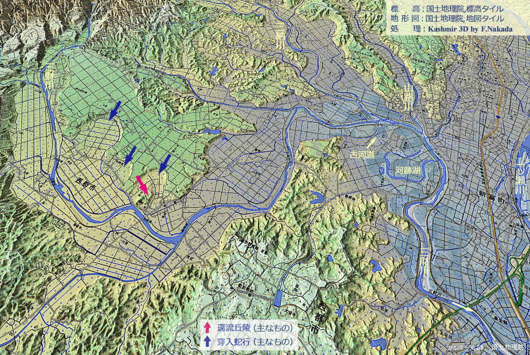 | 標高段彩図の三次元イメージと環流時の推定流向 : 穿入蛇行跡と環流丘陵 |