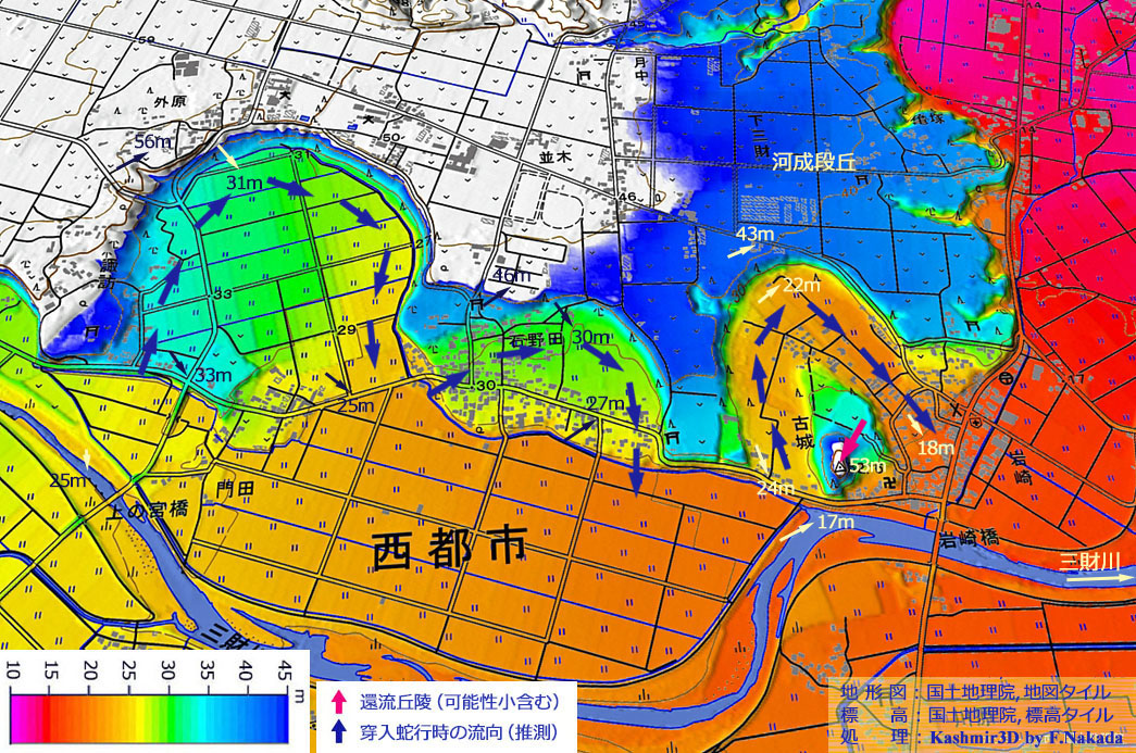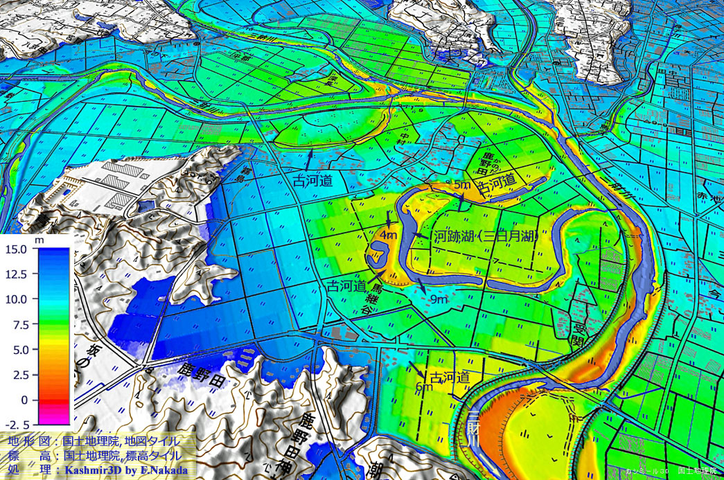 ![]() 住居のある土地の標高は,最低でも9mはあります。 これに対し,河跡湖が確認できる土地の標高は,概ね6mより低いようです。 標高約4mの凹地は,恐らく「古河道」で, 「逆C字」の池も「河跡湖(三日月湖)」と思われますが,当時の川の流れを想像するには,情報が足りません。 「霧島地区」と「中村地区」の間の右岸にも,半円形の「古河道」が存在するようです。 |