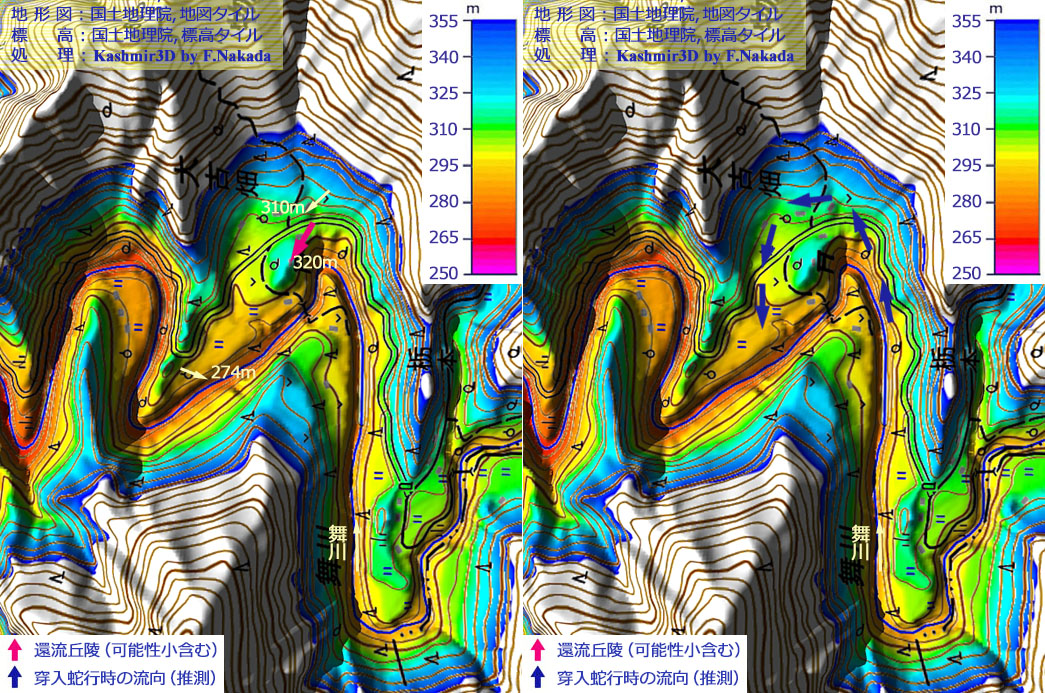 ![]() 「環流丘陵」部の拡大です。 現河床の標高約274mに対し,中央丘陵の標高は約320m,環流部の最高地点の標高は約310mあります。 環流部の背後に大きな河川が無いので,離水後の地形が大きく変化していないとると,蛇行(環流)時の標高は310mよりやや上を流れていたかもしれません。 |