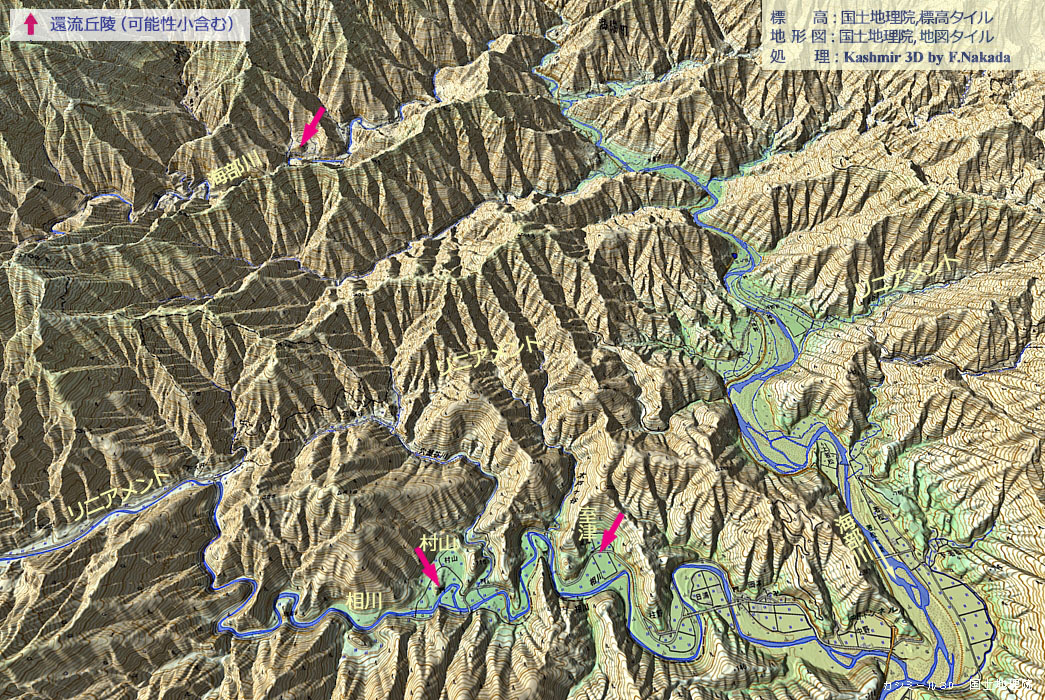 | 標高段彩図の三次元イメージと環流時の推定流向 : 海部川(本流)上流部 |
