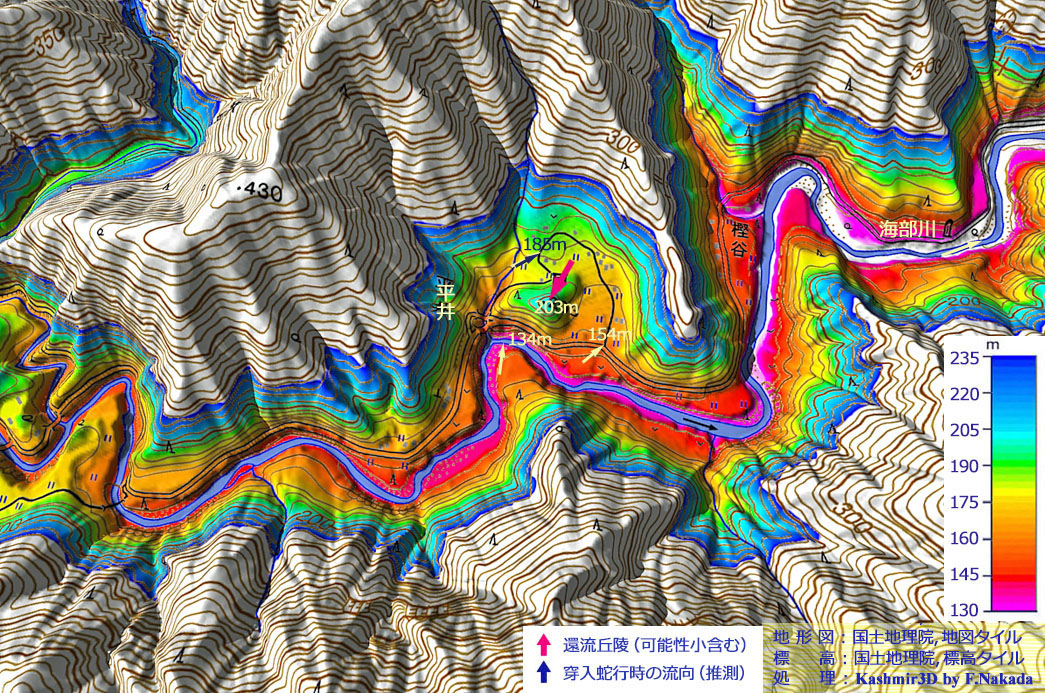‼マウスオーバー‼ 地図上にマウスを乗せてください。事務局が推定した「穿入蛇行時の流路」を表示します。![]() 海陽町平井地区は,直径400m程の「環流丘陵」の中にあります。 現河床の標高差が約134mであるのに対し,環流部(現段丘面)の最高点のそれは約185mあります。 標高差が約50mあるので,穿入蛇行の狭隘部が切断されたのは,かなり古いことがわかります。 |