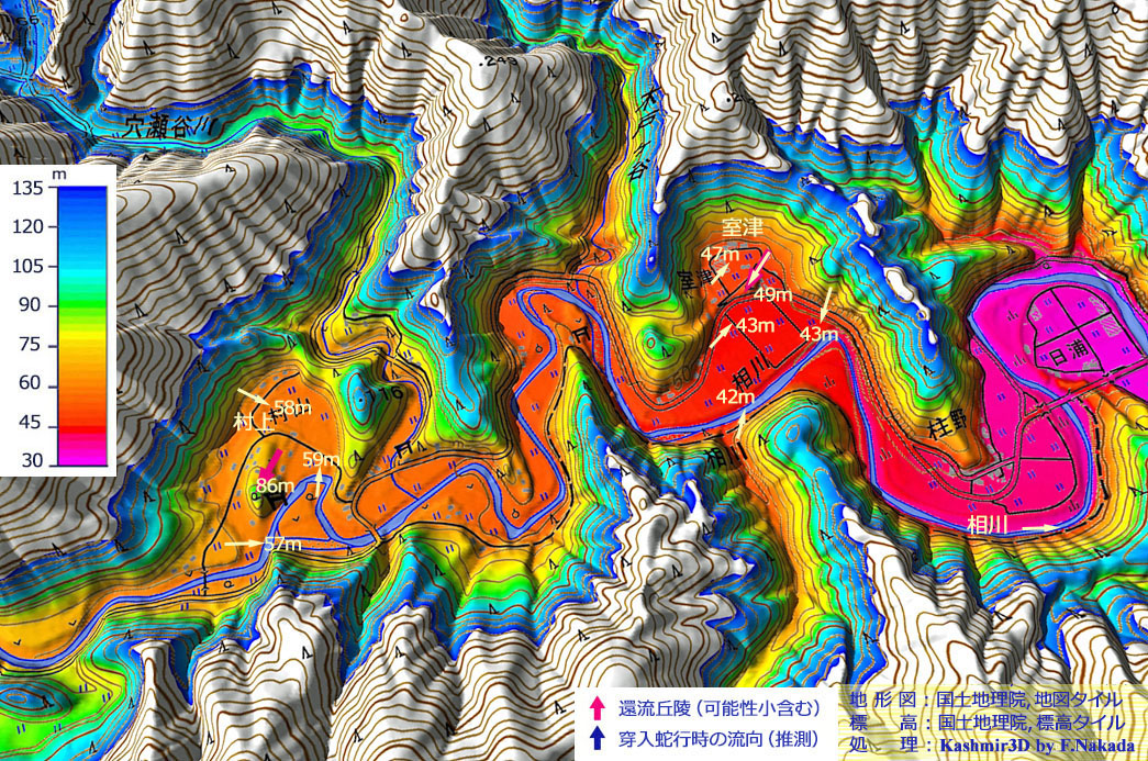 ‼マウスオーバー‼ 地図上にマウスを乗せてください。事務局が推定した「穿入蛇行時の流路」を表示します。![]() 支流の「相川」は,本流である海部川の下流に合流しているため,河床の標高はかなり低くなっています。 「沖積低地(氾濫原)」の幅がかなり広く,現在の相川はその中を「自由蛇行」状態で流れています。 相川には2か所の「環流丘陵」があります。 上流の「村山地区」では,現河床との標高差は約1mなので,地質的年代の尺度で,最近まで蛇行していた印象があります。 下流の「室津地区」の場合,最奥の標高約47mの付近が離水したのはやや古いと思われますが, その手前の円弧部分の離水と耕地化は,相川が直線的に流れるように工事(川廻し)した結果かもしれません(未調査)。 |