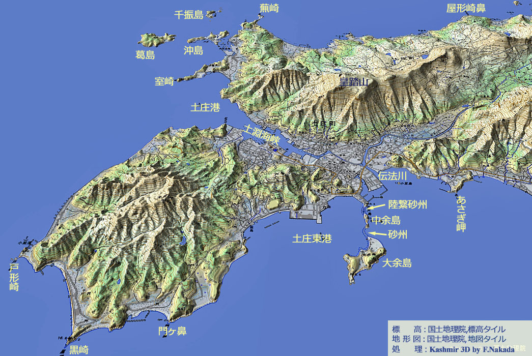 | 地形の三次元イメージ : 陸繋砂州と余島(大余島,中余島,小余島,弁天島) |
