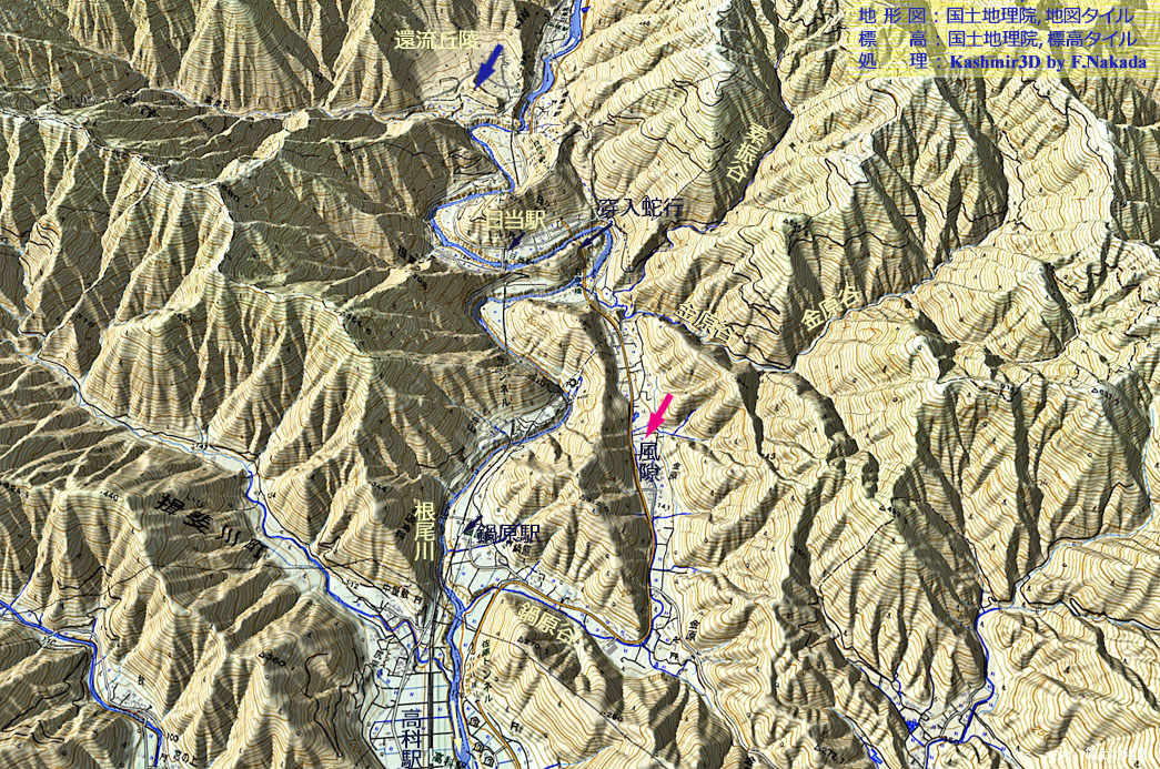 ‼マウスオーバー‼ 地図上にマウスを乗せてください。事務局が推定した「河川争奪前の流路」を表示します。![]() 「NOBUSAN BLOG(下記)」などによると,約100万年前には,「金原谷」と「鍋原谷(なべらたに)」とは繋がっていました(同じ谷でした)。 その後の断層活動によって,上流の金原谷側は図の右方向に徐々にずれたため,河道は「金原谷 ➡ 現風隙(古河道) ➡ 鍋原谷」となりました。 現風隙(古河道)の区間は次第に延びて行き,根尾川の近くに達したところで「河川争奪」が起き,河道は「金原谷 ➡ 根尾川」となりました。 注 河川争奪が起きる前までは,長さ約2kmの現風隙の区間には金原谷の河川水が流れており,争奪後に風隙となったのです。 |