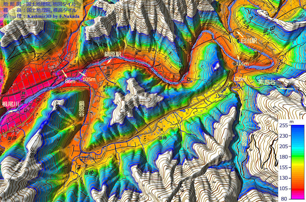 | 標高段彩図の三次元イメージ : 根尾川の環流丘陵 |