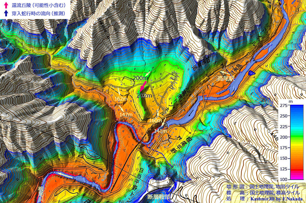 ‼マウスオーバー‼ 地図上にマウスを乗せてください。事務局が推定した「河道変遷前の流路」を表示します。![]() この「環流丘陵」らしき地形は,「根尾谷断層」による「断層鞍部」から離れており,この断層の直接的な影響はなかったかもしれません。 環流部最高点の標高は約200mで,現河床のそれは約141mです。 標高差が60mほどあるので,切断と離水の時期はかなり古いことが想像されます。 |