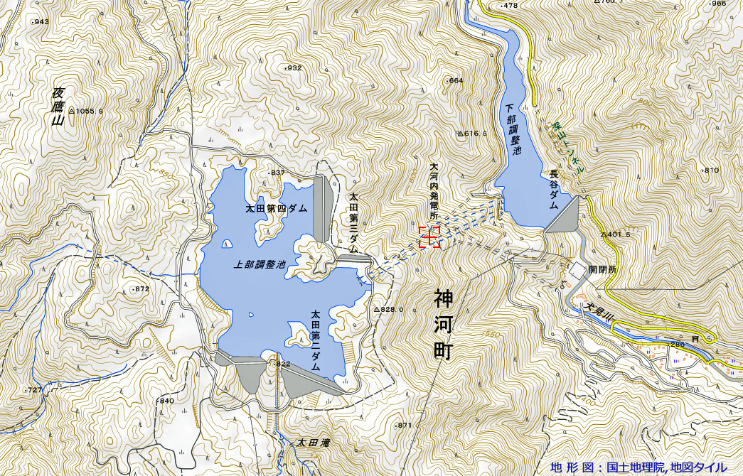 ‼マウスオーバー‼ 地図上にマウスを乗せてください。国土地理院「国土画像情報1974年~1978年(出典,下記)」を表示します。![]() 1974年~1978年に撮影された空中写真では,1994年頃に上部調整池(太田ダム)の場所に,既に小さなダムが建設されていることがわかります。 大河内発電所の稼働開始は1992年10月とのことなので,別の目的のためのダムだったのかもしれません(未調査)。 |