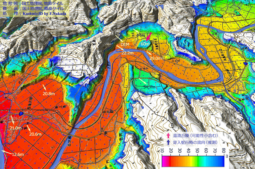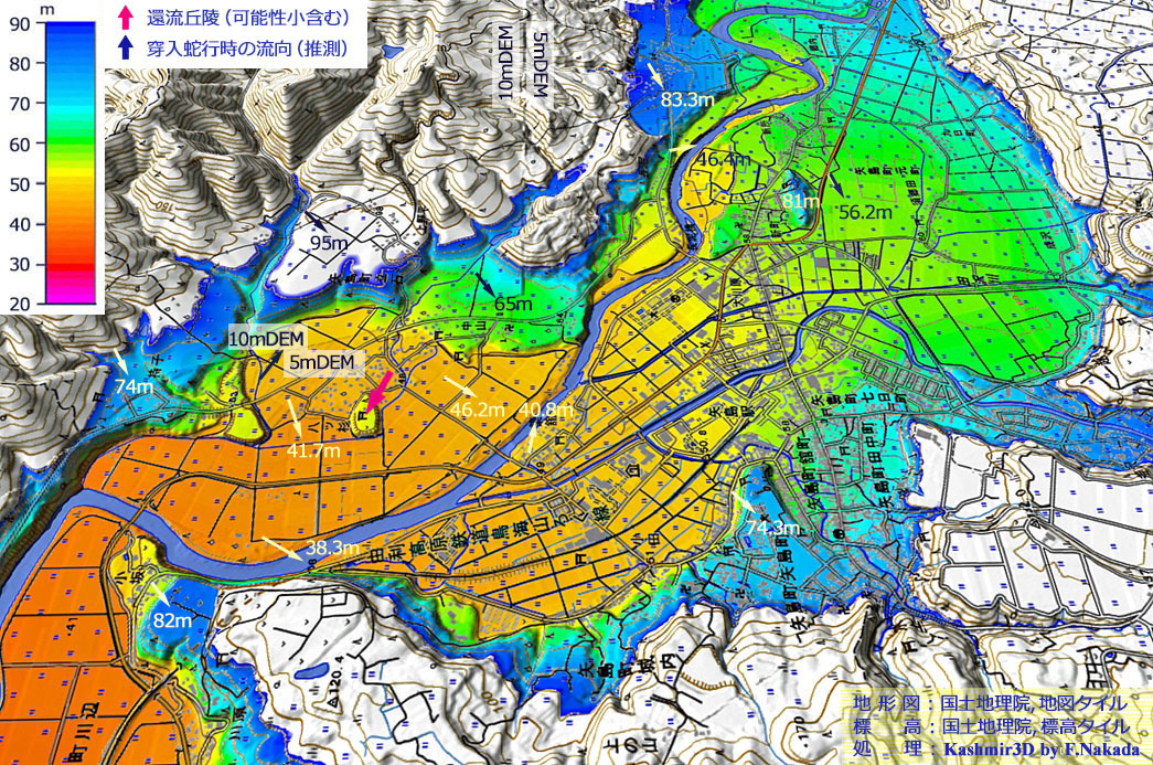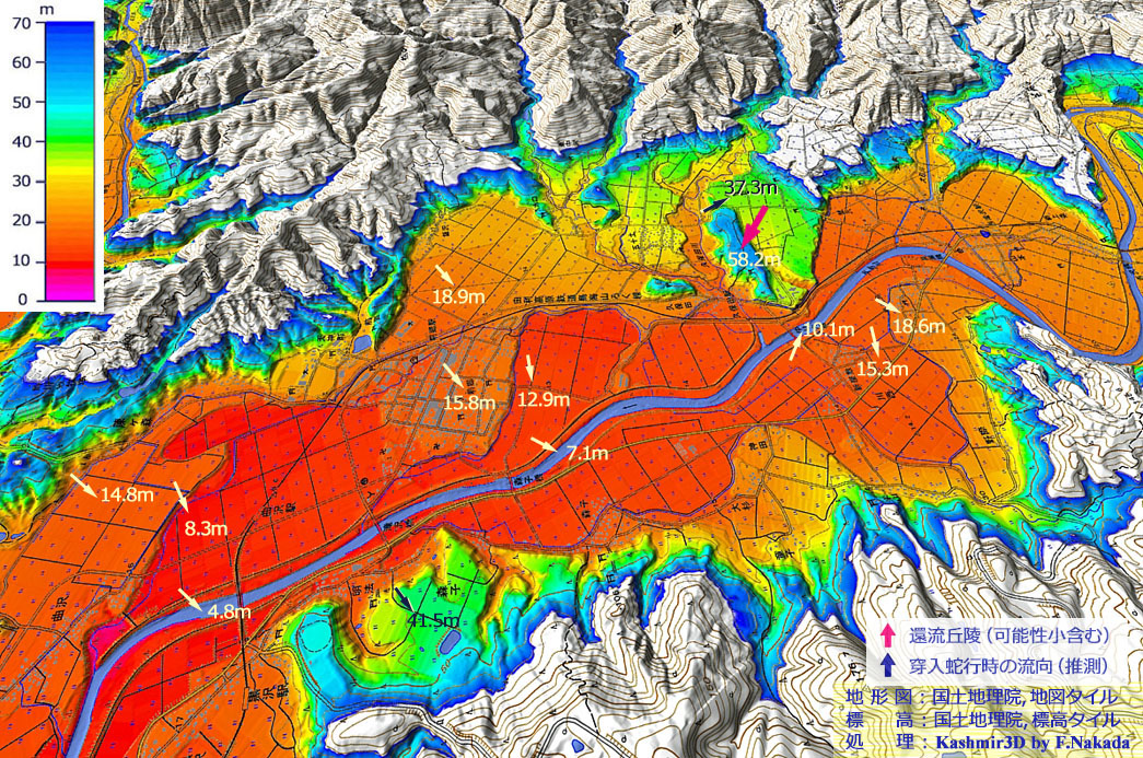 ‼マウスオーバー‼ 地図上にマウスを乗せてください。事務局が推定した「穿入蛇行時の流路」を表示します。![]() 本図の右岸側にも,想定「環流丘陵」が存在します。 この環流丘陵は,旧環流部の標高値(約42m)と現河床のそれ(約38m)の差が僅かなので,年代的に最も新しいのではないか,と考えています。 なお,標高65mの部分は「段丘」ですが,その後の「側方侵食」によって平面的に狭められたため,環流丘陵の一部だったかどうかはわかりません。 |