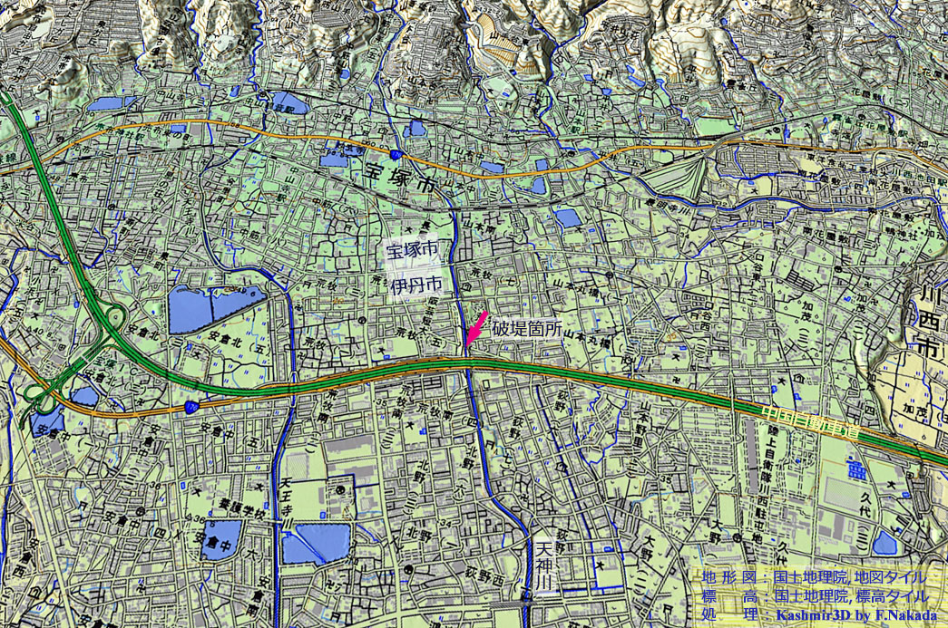 | 兵庫県:伊丹市を流れる天神川と天王寺川は天井川 |