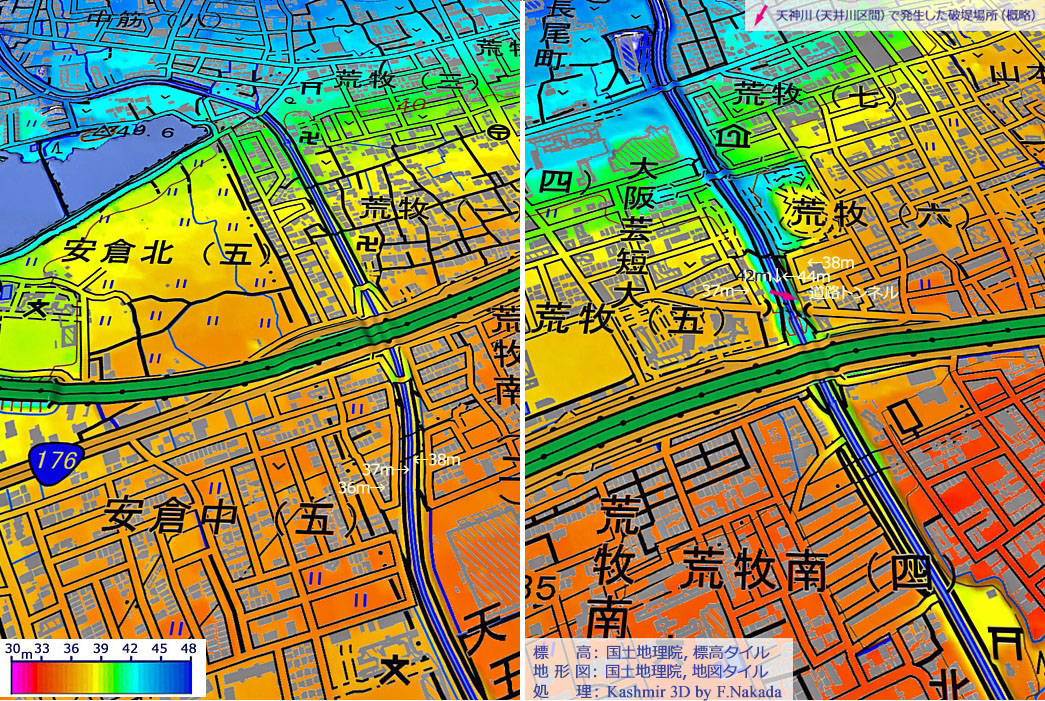 | 標高段彩図の三次元イメージ : 天神川と天王寺川の天井川区間 |