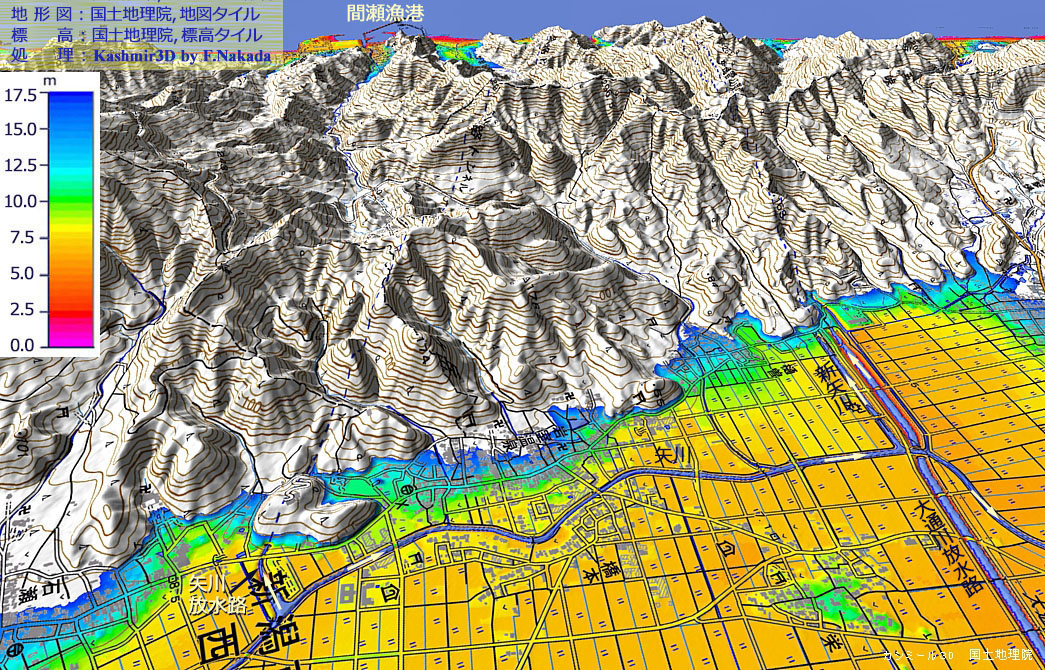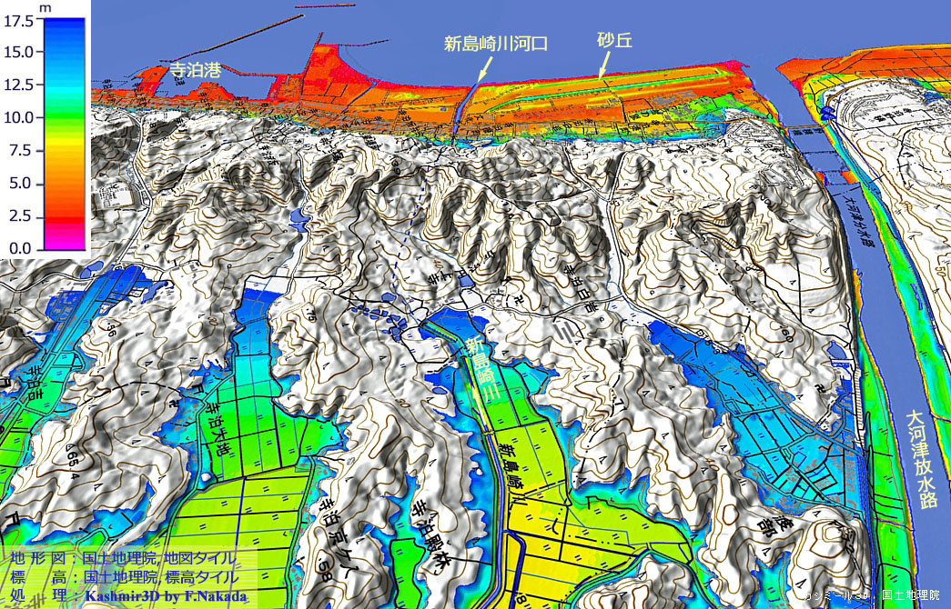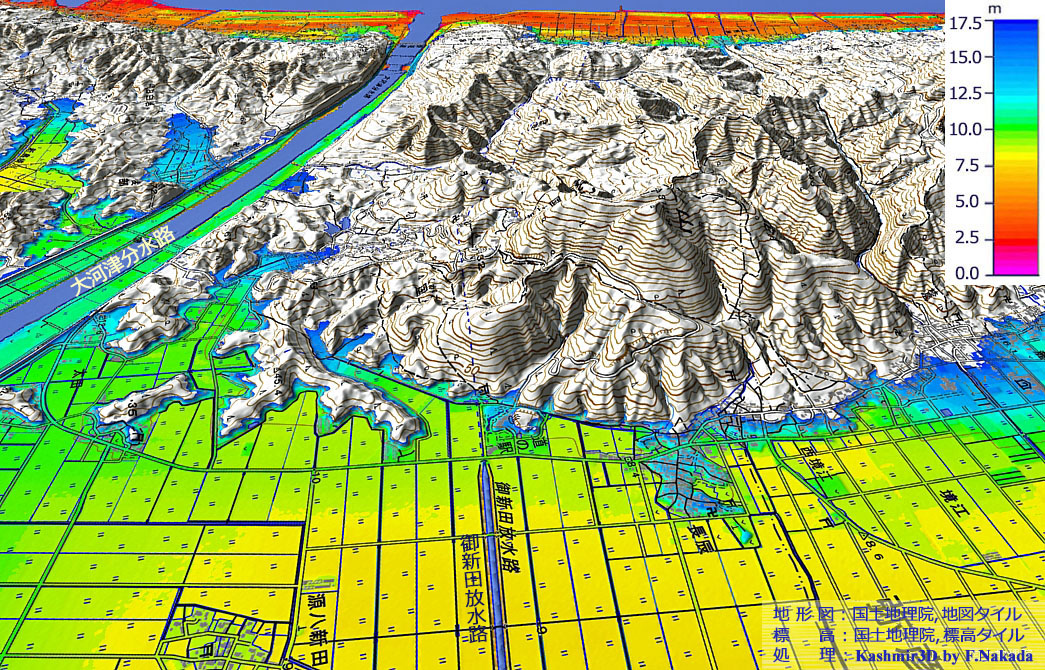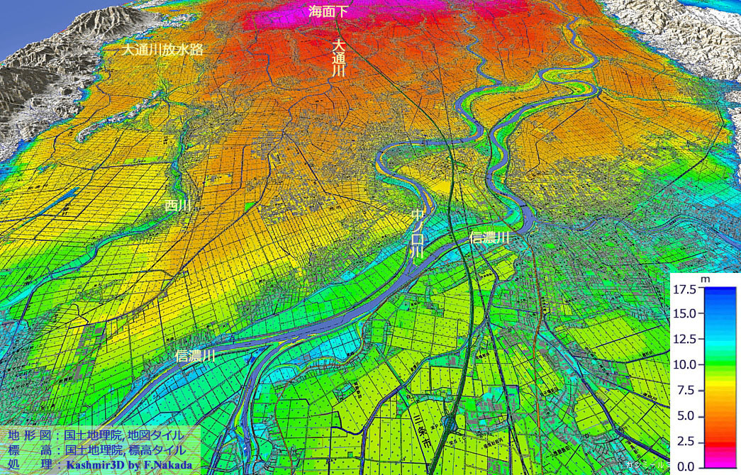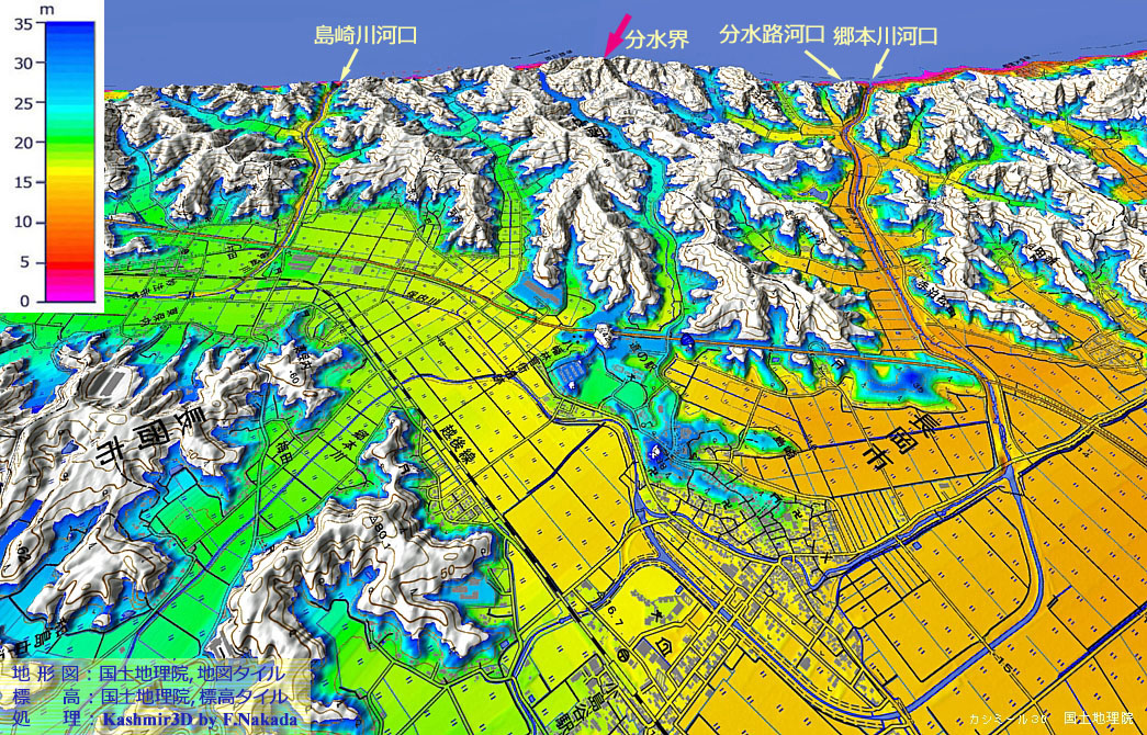 | 標高段彩図の三次元イメージ:西蒲原平野主要部と排水用隧道の概略位置 |