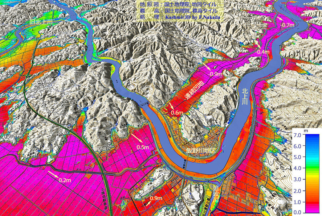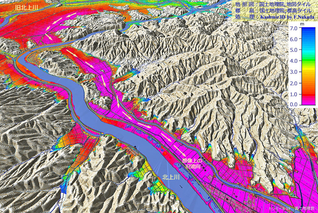 | 標高段彩図の三次元イメージ :推定・古北上川の流向線 |