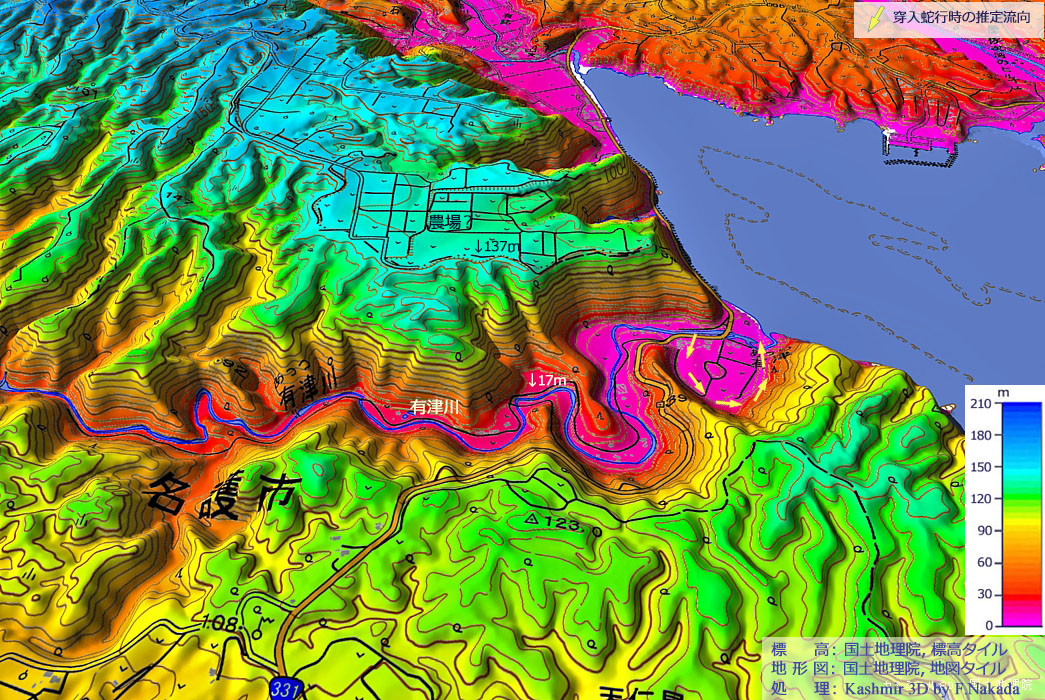 | 標高段彩図の三次元イメージ : 有津川河口の環流丘陵(推定) |