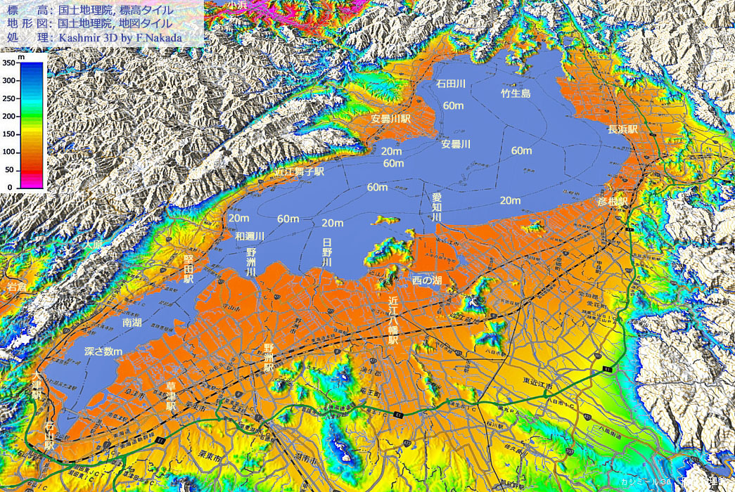 | 標高段彩図と地質図の三次元イメージ : 琵琶湖とその周辺 |