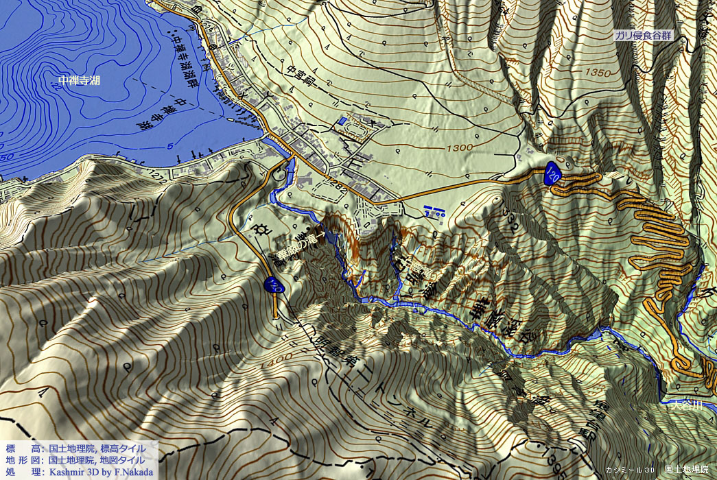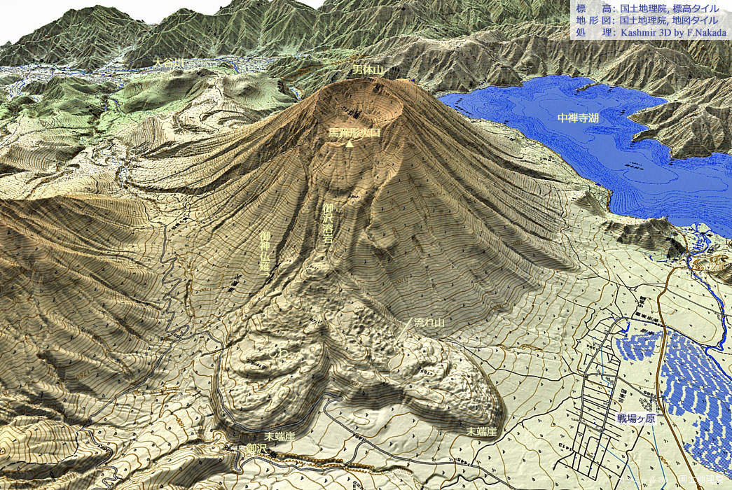 | 地形と地質の三次元イメージ : 男体山北面と御沢溶岩流 |