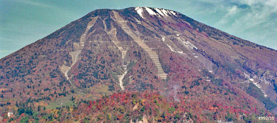 ![]() 第一いろは坂を通行中,明知平越しに一瞬だけ男体山が見える場所があります。 山頂近くまで砂防堰堤が建設されています。 |