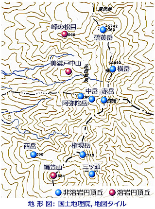 三ッ頭溶岩(Ml)などが噴出し,その後新八ヶ岳火山群へと移行しました。 |