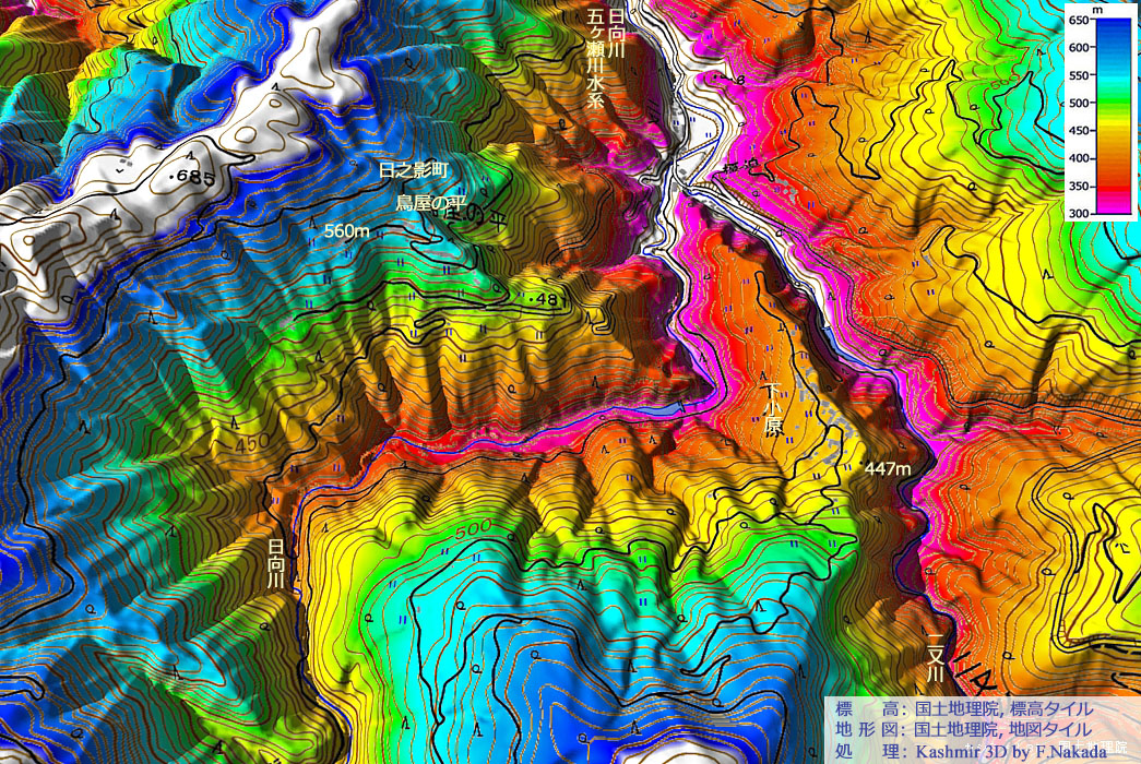 地図上で1回クリックすると,産総研・地質調査総合センターの「1/20万 シームレス地質図(出典,下記)」を表示します。 ダブルクリックで元に戻ります。![]() 「五ヶ瀬川」の支流の一つである「日向川」は,日之影町と諸塚村の境にある「真弓岳(1073m)」付近が源流域となっています。 日向川が枝谷の「二又川」と合流する付近にある二つの独立した尾根の上に,集落が形成されています。 まるで,「隠田集落」のような印象です。 鳥屋の平集落の地質は「泥岩[後期白亜紀・付加体]」で,下小原集落は同年代の「砂岩泥岩互層[付加体]」ですが, なお,前者の最下部には「玄武岩[付加体]」が,ほぼ垂直地層として分布しているようです。 いずれの集落とも,標高の高い山や尾根が近くにあるので,谷川からの引水で何とかなっていたのでは,と想像します。 |