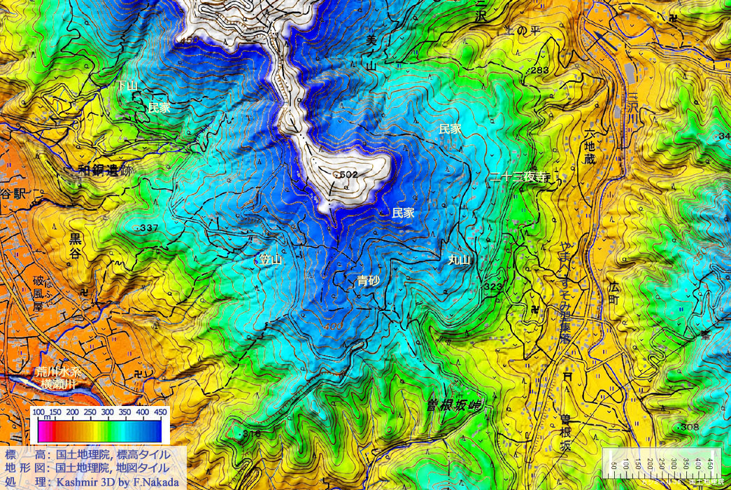 地形図上で1回クリックすると,埼玉大学の「今昔マップ on the Web(出典,下記)」を表示します。 ダブルクリックで元に戻ります。![]() 「青砂集落」や「丸山集落」が別荘地ではなく,昔ながらの集落であることを確認するために,5万分の1古地形図を参照しました。 (民家の位置が微妙に違いますが,これは古地形図が戦前に作成されたため,精度が最新のものよりも悪かっためと思われます。) 両集落を含む「502m峰」の東から南側の斜面は緩傾斜で,この斜面を整形して集落が造られています。 この緩斜面は古い年代に発生した地すべりの跡地です。 地すべりによって滑り落ちてきた「移動体」が,この場所で停止した結果,緩斜面となったのでしょう。 |