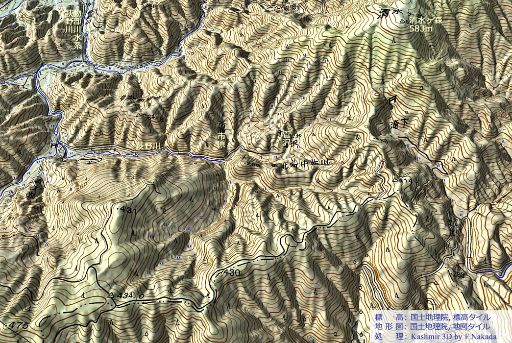 地形図上で1回クリックすると,産総研・地質調査総合センターの「1/20万 シームレス地質図(出典,下記)」を表示します。 ダブルクリックで元に戻ります。![]() 物部川は,ほぼ「仏像構造線」に沿って西南方向に流れています。 そして,萩野川は物部川中流部,左岸側の支流です。 萩野川の流域は,仏像構造線の南側になるため「四万十帯(中生代,ジュラ紀~白亜紀)」 が分布しています。 萩野川の源流部は,四万十帯のは「混在岩・付加体」です。 しかし,途中で突如流れの方向を変え,四万十帯の各地層を断ち割る様にして北流していきます。 |