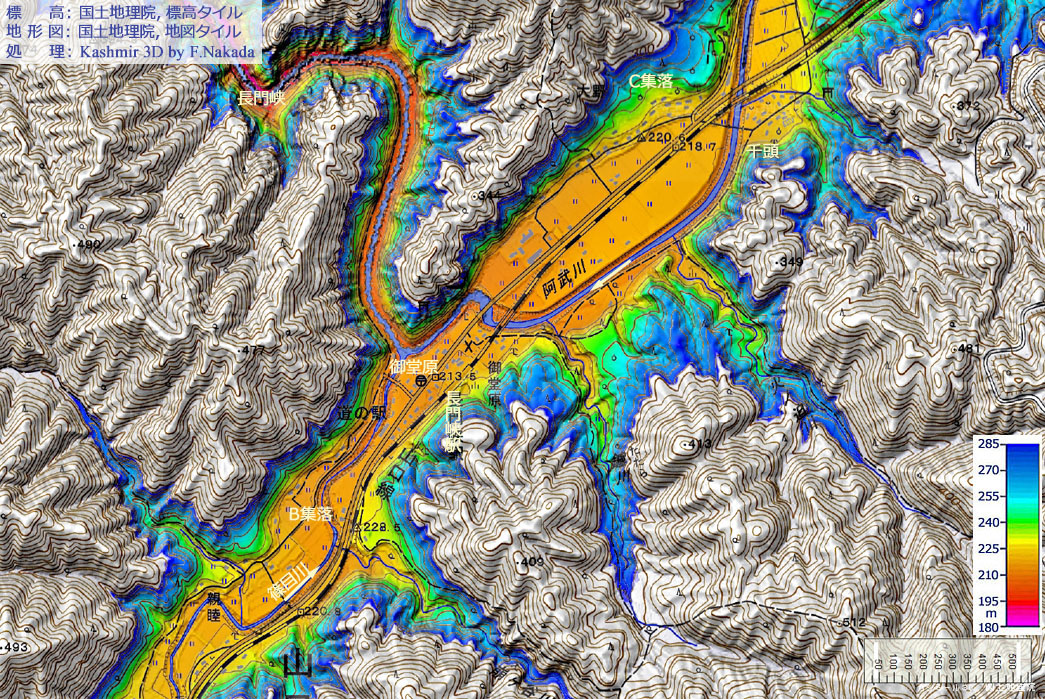 ![]() 地質図を参照すると,完新世の氾濫原(谷底平野堆積物)の上に形成されている集落は,「御堂原」,「B」と「千頭」の各集落と思われます。 図右上の「C集落」は中位段丘面上かその周辺に立地していると思われるので「やまへ・すそみ型集落」かもしれません。 |