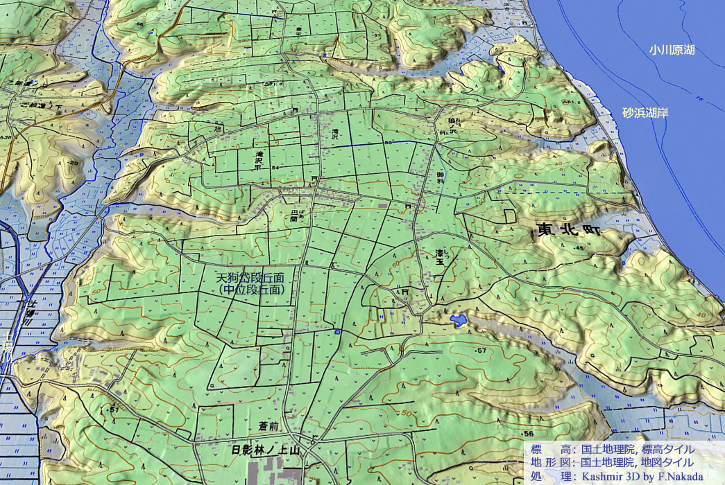 ![]() 青森県の上北地方には,「海成段丘」が広範囲に分布していることが知られています。 小川原湖の西岸沿いには「天狗岱面」という,地形的には中位段丘面に相当する「海成段丘面」が台地状に拡がっています。 「滝沢集落」や「御料集落」などの民家群(集落)は,この天狗岱段丘面のほぼ中央で形成されました。 ただし,地下水が得られにくい段丘面中央部に集落ができたのは,上水道が整備されてからのことでは,と想像します。 |