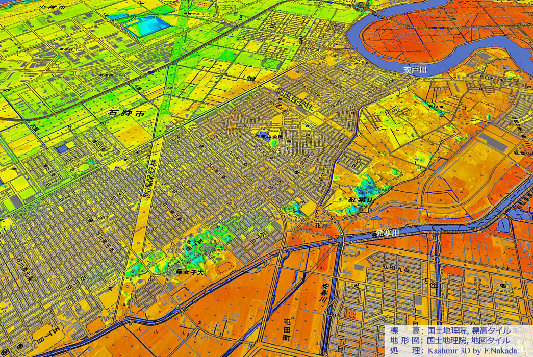 | 地形(標高段彩図)と治水地形分類図の三次元イメージ |