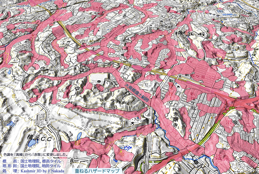 | 大規模盛土図(準あはら図)と地形図(標高段彩図)の三次元イメージ:横浜市保土ヶ谷区~旭区(部分) |