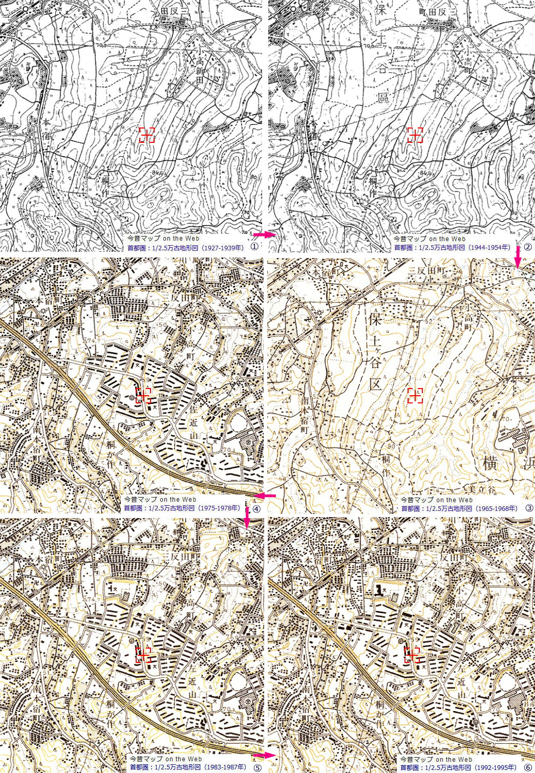 地図上で1回クリックすると,⑥図に横浜市が作成した「大規模盛土図」を表示します。 ダブルクリックで元に戻ります。![]() 本図の範囲に限定すれば,深い谷を埋めて平坦地を造成できたのは,1970年(昭和45年)代以後のようです。 その理由は,ブルドーザなど大型の建設機械が容易に手に入るようになったためでしょう。 |