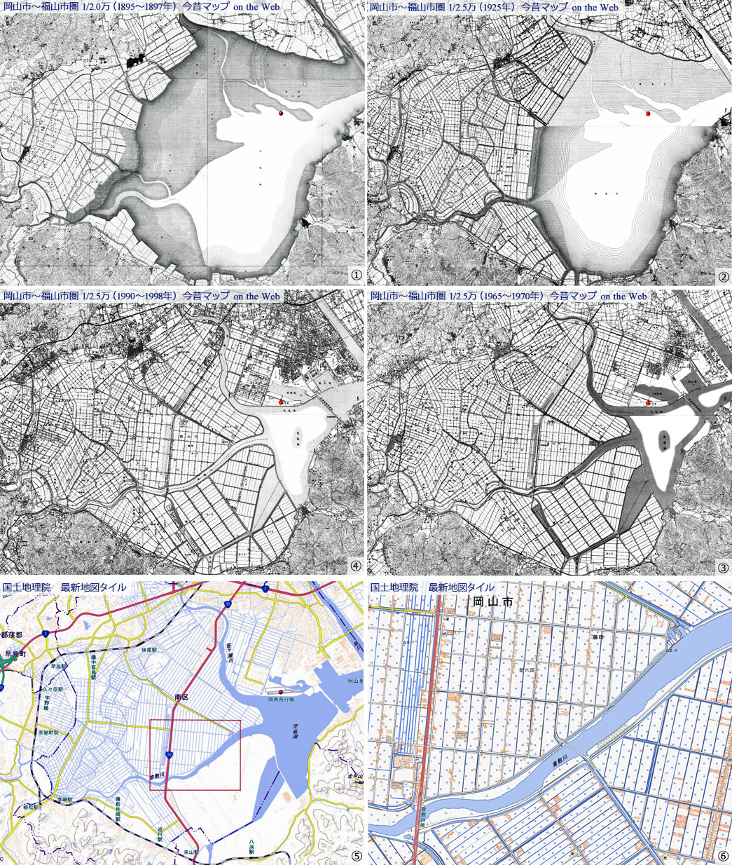 ![]() ① 1890年代の半ば以降の地形図では,児島湾最奥部の海岸の一部が直状を呈しています。 これは江戸時代に行われていた干拓事業の結果です。 ② 太平洋戦争開始前の段階で,かなりの「干潟」が干拓によって陸地化しました。 「藤田組(現・DOWAホールディングス)」による干拓事業の結果です。 ③ 太平洋戦争終了後約20年が経過した時点で,児島湾奥の干潟などは殆ど干拓される一方,海面は締め切られて「児島湖」となりました。 ④ 更に20年が経ちましたが,干拓地の外形上の変化は認められませんが,民家群が増えているような感じがします。 ⑤ 最新の地形図でも,干拓地の大枠は変わっていないことが確認できます。 しかし⑥のように地形図を拡大すると,水田の間に民家がかなり多いことがわかります。 |