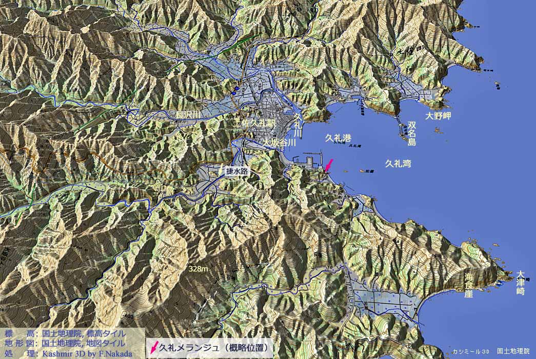 ‼マウスオーバー‼ 地図上にマウスを乗せてください。産総研・地質調査総合センターの「1/20万 シームレス地質図(出典,下記)」を表示します。![]() 「メランジュ」とは,付加体の地層の中で,様々な岩石が混然一体となっていて区分できない状態のもの,を言います。 1/20万シームレス地質図では,「混在岩」として表記されています。 地質図は1/20万シームレス地質図です。 三次元イメージの縮尺は約1/30万程度になっているので,表示精度にご注意ください。 |