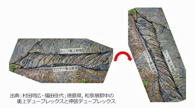 ‼マウスオーバー‼ 地図上にマウスを乗せてください。産総研・地質調査総合センターの「1/20万 シームレス地質図(出典,下記)」を表示します。![]() 「デュープレックス」とは,「衝上断層」が活動するときに,移動する地層が動かない地層の上面を何回もはぎ取った結果,瓦状に積み重なった構造のことです。 「村田・福田(2012)」によると,いずれのデュープレックスとも,和泉層群の「砂岩泥岩互層」の中で確認したとのことです。 詳しくは原典を参照ください。 |