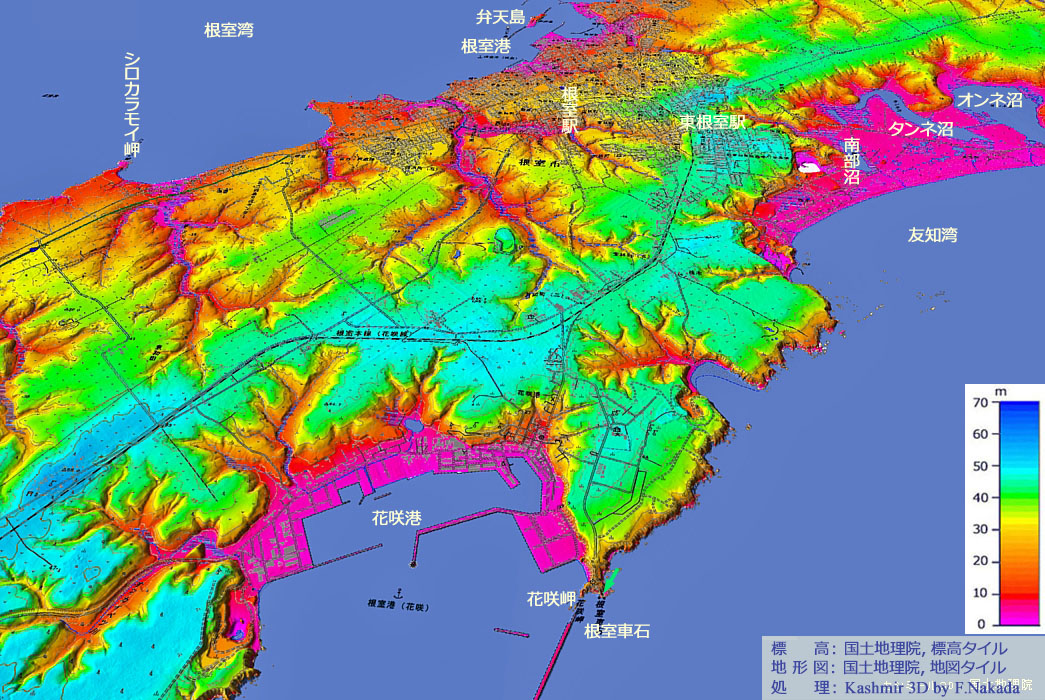 | 地形の三次元イメージ:根室半島と花咲港[事務局作成] |
