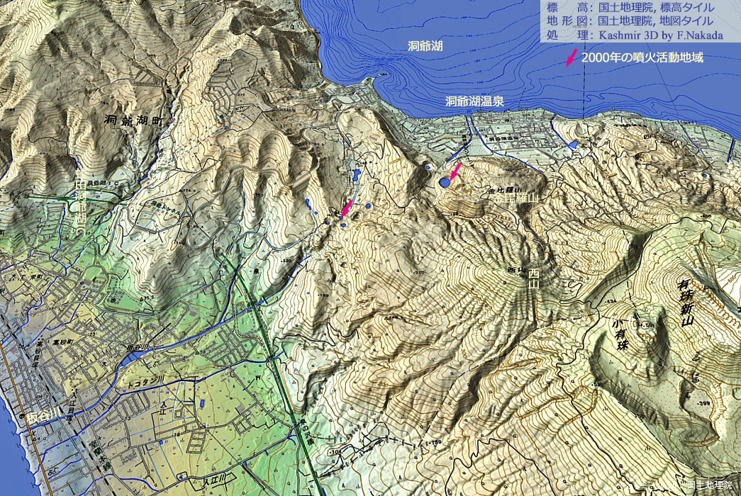 ‼マウスオーバー‼ 地図上にマウスを乗せてください。産総研・地質調査総合センターの2.5万分の1 『有珠火山地質図』(出典,下記)」を表示します。![]() |