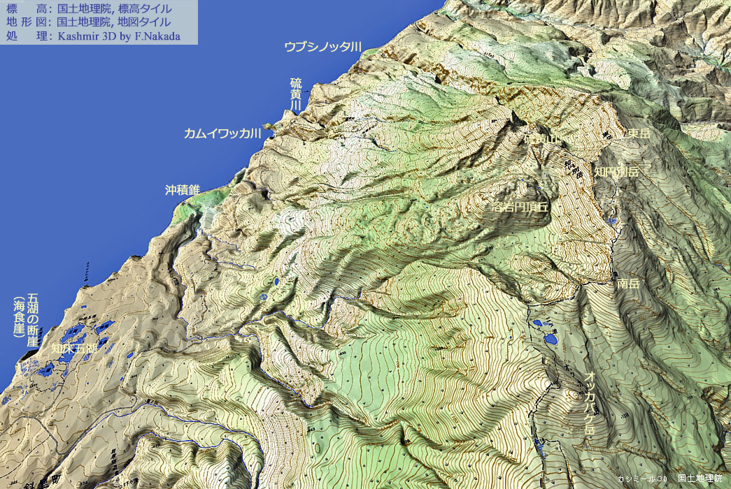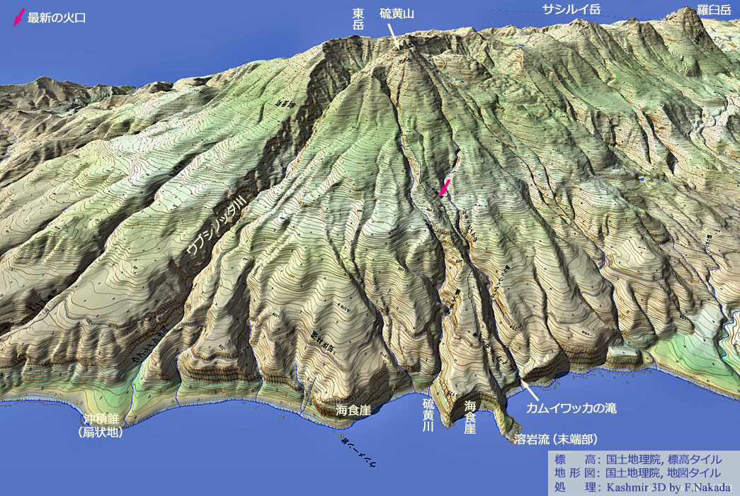 ![]() 「知床硫黄山」と「東岳」の間には,大きな「爆裂火口」が存在します。 硫黄山の北麓を流れる「ウブシノッタ川」の「源頭」は,その火口にまで達しています。 「ガリ侵食」が巨大化したような形態をしていて,源頭から河口までほぼ直線状で,深さ200m弱の大峡谷となっています。 河口には,半径約200mの半円状の「沖積錐(扇状地)」が形成されていて,運ばれてきた土砂の多さが類推されます。 |