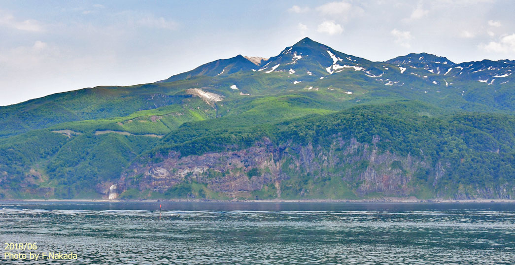 ![]() 知床硫黄山(1563m)の中腹にある白い部分は,1936(S11)年に「溶融硫黄」を噴出した新噴火口です。 海に直接落ちる滝は「カムイワッカの滝」です。 新噴火口付近の源泉からのお湯が流れ込んでいるため,上流ではいわゆる「湯の川」なのです。 |