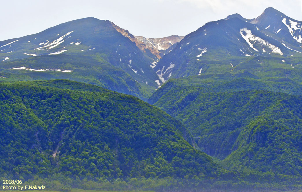 ![]() 「東岳(1520m)」~「硫黄山(1563m)」間の「爆裂火口(一部)」,それを侵食する「ウブシノッタ川」と,火口の左側のピークの東岳。 |