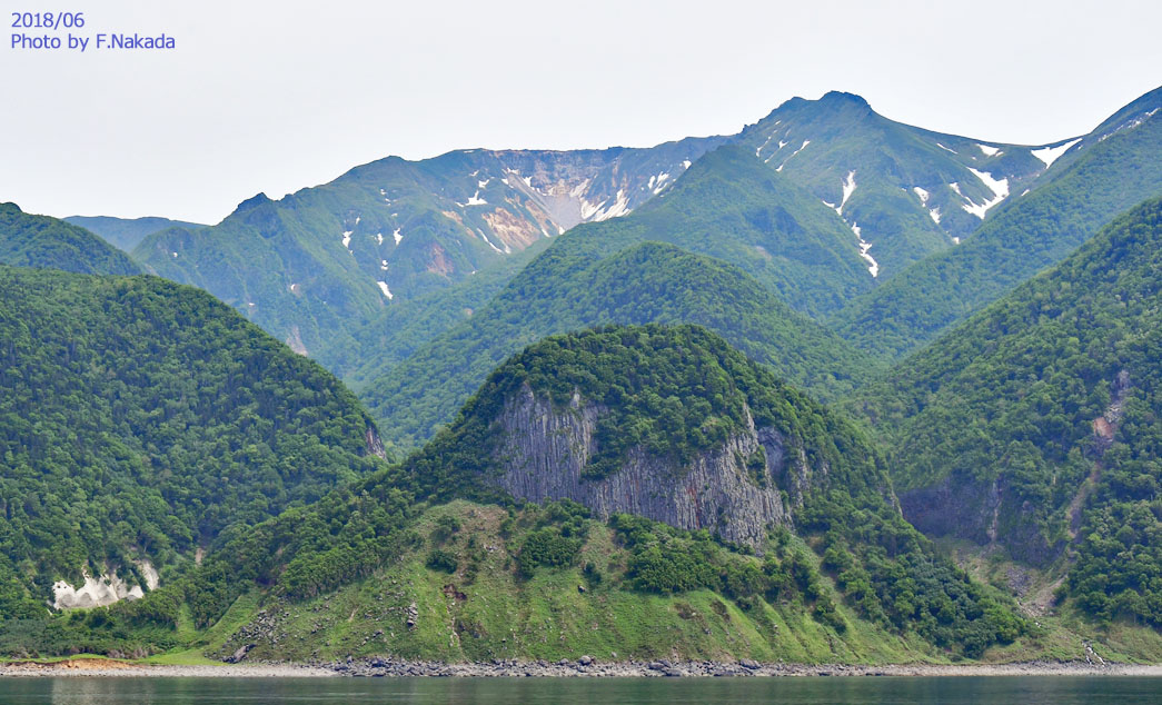 ![]() 知床岳(1254m)とその「爆裂火口」です。 手前のドームは,はるばる山頂から流れ下って堆積した溶岩の末端部で,「柱状節理」が発達しています。 左下の白い崖は,この辺りには珍しい「シルト岩」です。 |