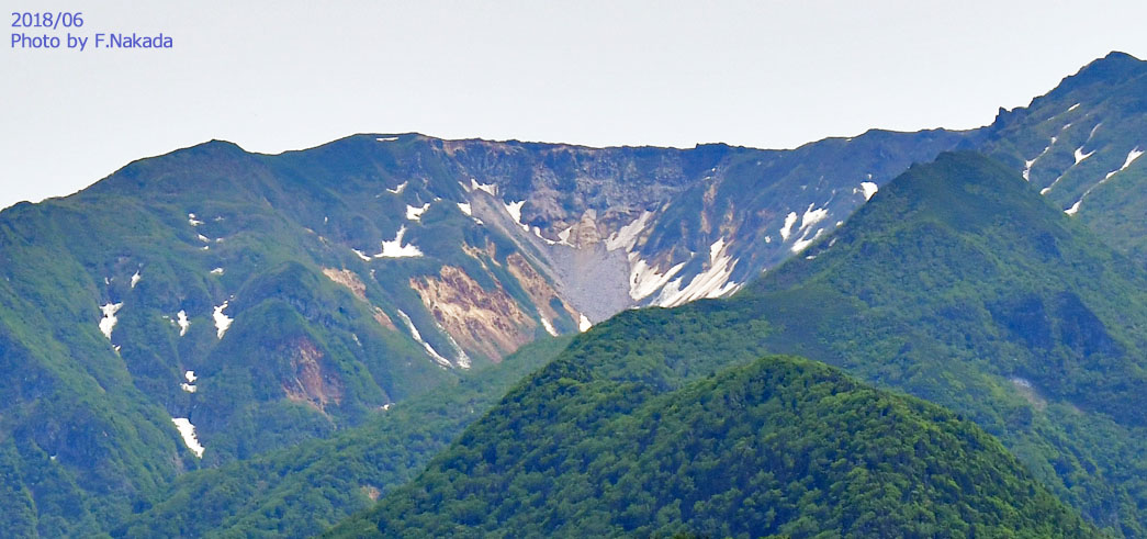 ![]() 知床岳の爆裂火口です。 谷底に写っている灰色の部分は,火口底に堆積している大量の「岩屑」でしょう。 「ポトピラベツ川」が爆裂火口にまで達しており,大量の土砂を持ち去っています。 |