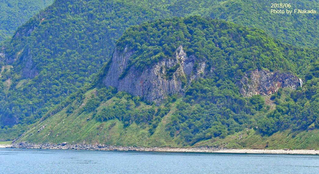 ![]() 溶岩流の末端部には,無数の「柱状節理」が発達しています。 右にわずかに見えている滝は,「知床川」が溶岩層を乗り越えているところです。 |