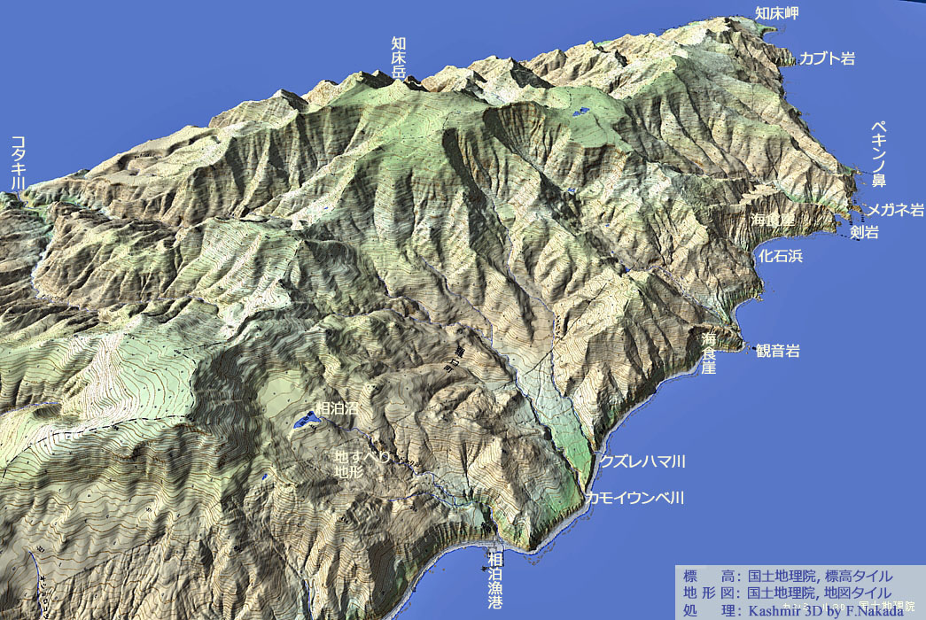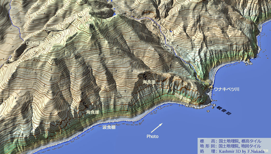 | 地形の三次元イメージ : 知床半島・観音岩周辺部の海食崖 |